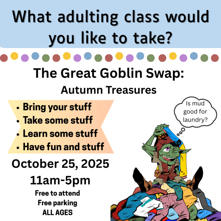 It’s time to get some classes scheduled! Even if you can’t make it to our first event… your answers help! What adulting class would you like to take? There are no right or wrong answers! There’s no judgement here! We’ve…