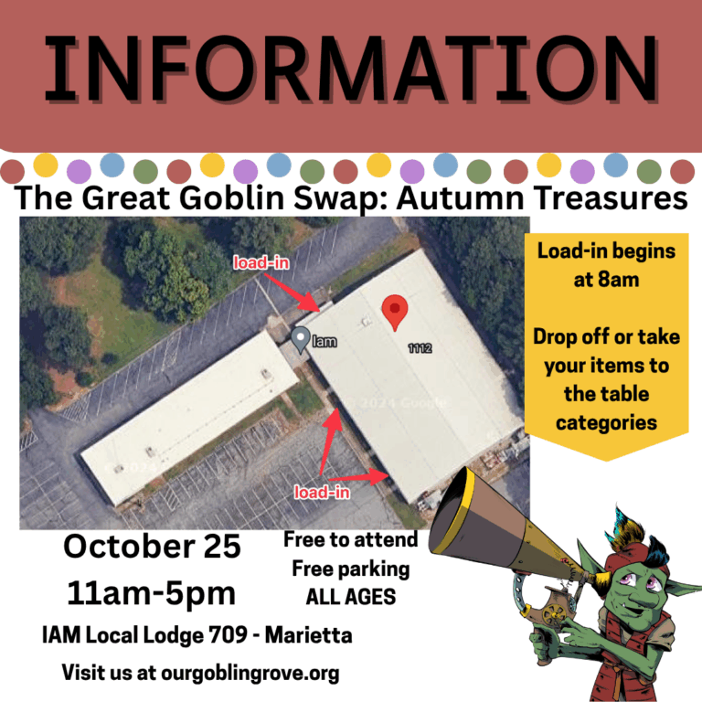 Load-in information! We will open doors for those who want to donate items to the swap at 8am on Oct 25!You can drop off if you want or you can walk inside and take your items to the marked table…